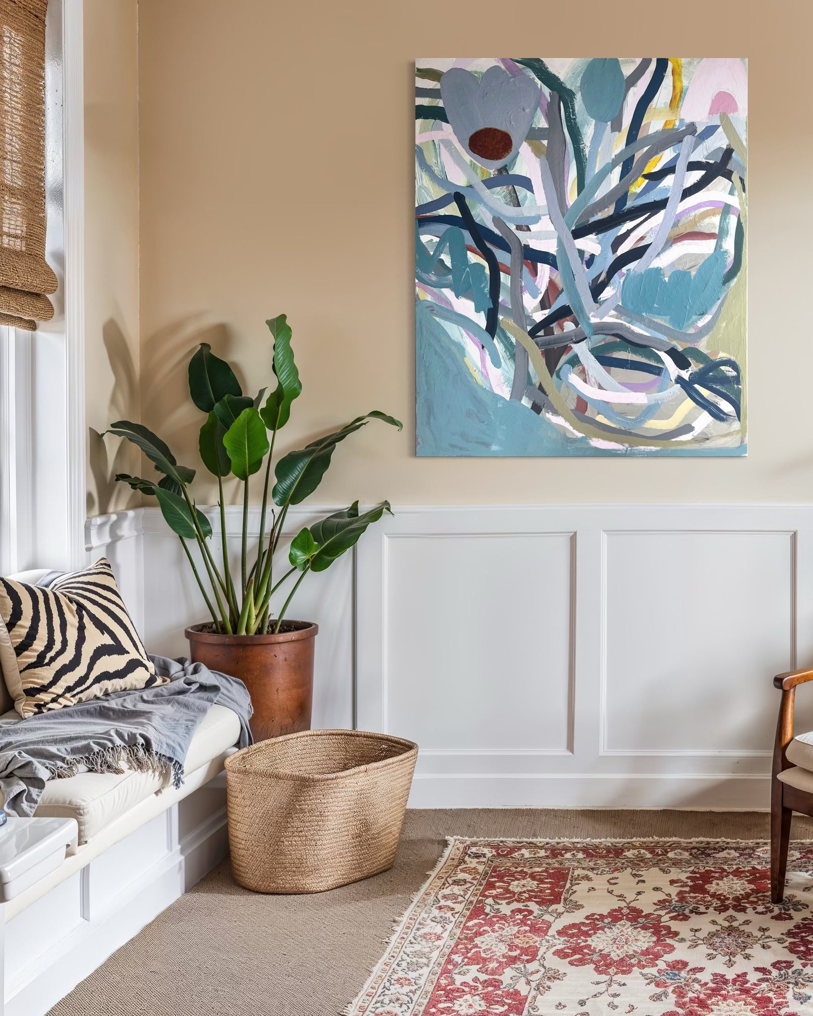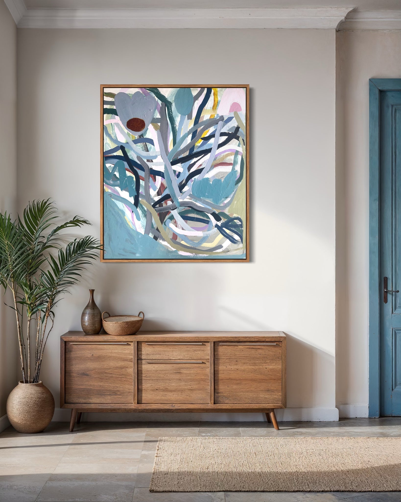 Maleriet har et roligt og drømmende udtryk. Fyldt med poetiske detaljer, som får fantasien til at vandre. Farverne er friske og harmoniske og det får den positive energi frem i kroppen når man går på opdagelse i det.. Et smukt maleri, som kan bidrage med mere personlighed til din indretning.