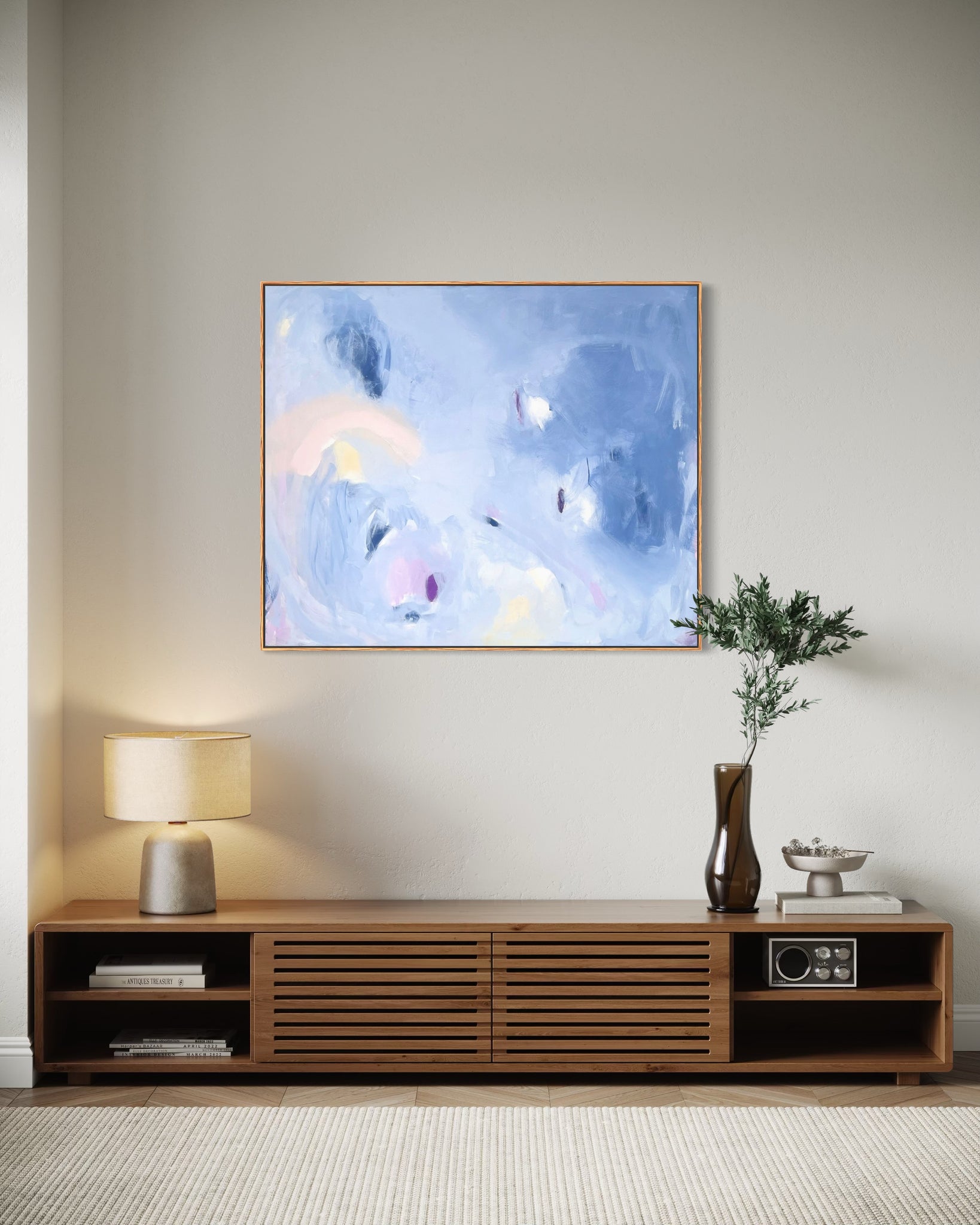 Træd ind i en drømmende verden med "Shades of Time", et maleri der fanger essensen af lethed og bevægelse. Med en beroligende palet af bløde blå nuancer og subtile pastelfarver inviterer dette værk til refleksion og introspektion. De flydende penselstræk skaber en atmosfære, hvor tid synes at svinde ind, og hvor nuancerne danser i en harmonisk symfoni.