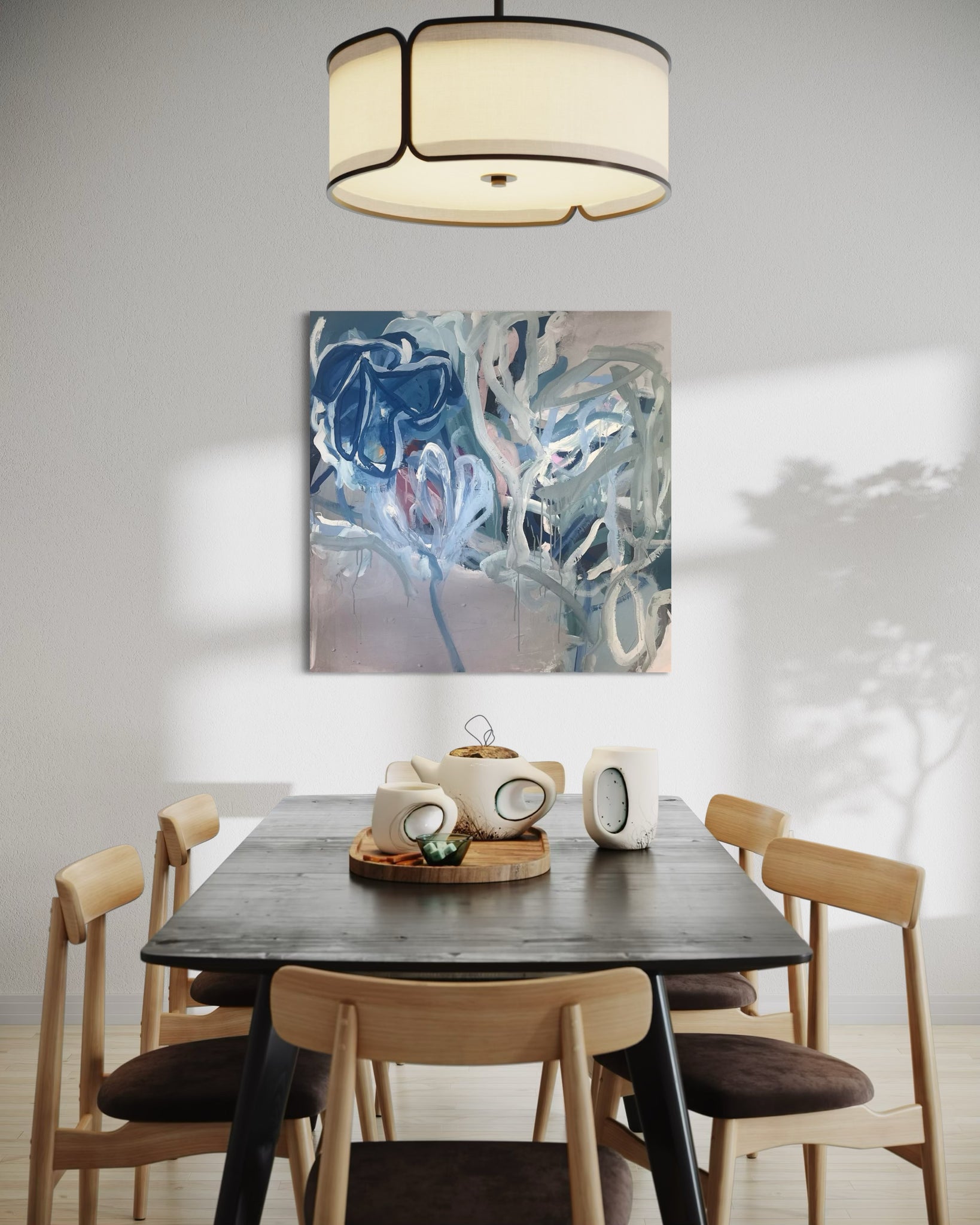 Maleriet har et roligt og drømmende udtryk. Fyldt med poetiske detaljer, som får fantasien til at vandre. Farverne er friske og harmoniske og det får den positive energi frem i kroppen når man går på opdagelse i det.. Et smukt maleri, som kan bidrage med mere personlighed til din indretning.